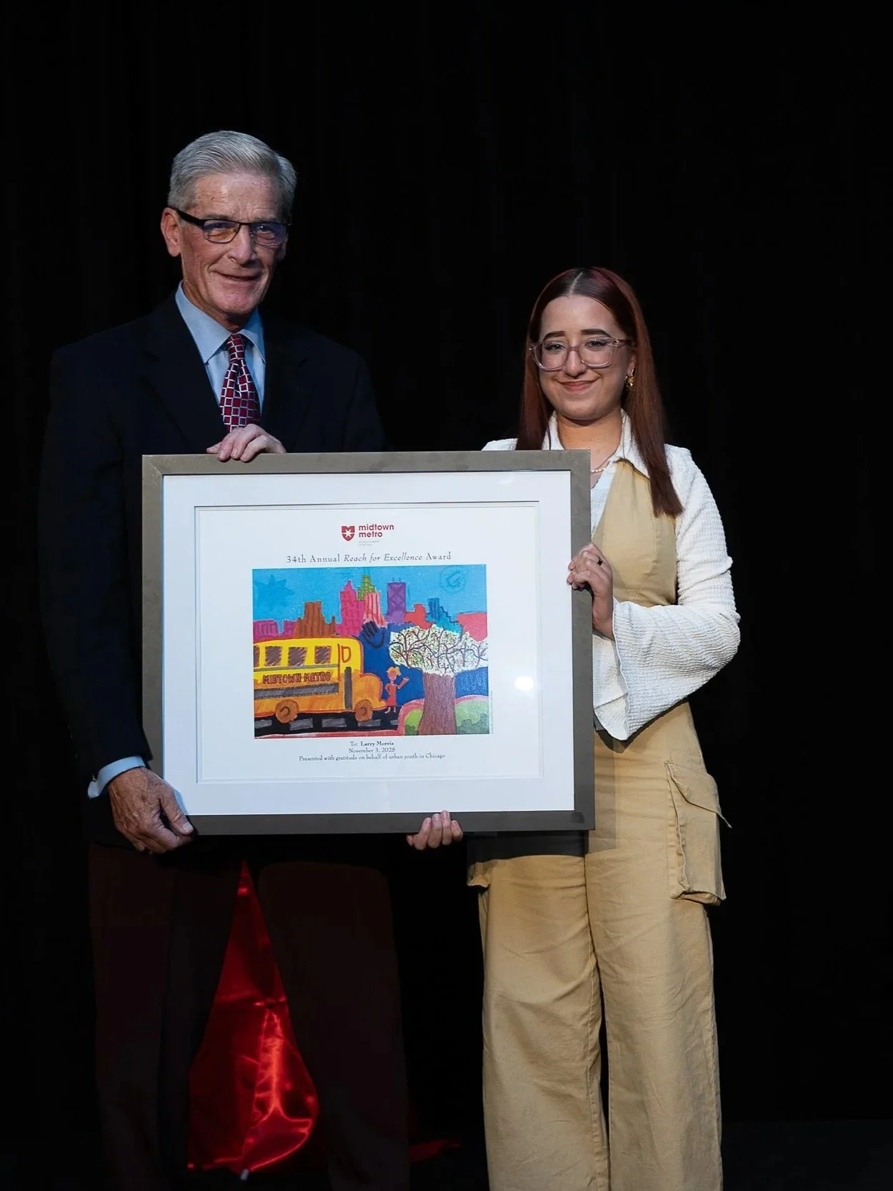 The main highlight of the evening was the presentation of the 2025 Reach for Excellence Awards, recognizing individuals whose leadership and service exemplify the values of Midtown-Metro. Larry Morris, a longtime board member and supporter who first joined the organization as a summer sports director in 1976, was honored for his decades of dedication to Chicago’s urban youth. Jim Doney, Chairman of Chicago Beverage Systems and a respected leader in Chicago’s hospitality industry, received the second award in recognition of his distinguished career and civic commitment. Both awards were presented by Alexa Contreras, with a bonus appearance by Metro alumnus, Casandra Vences.